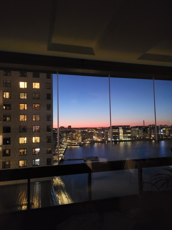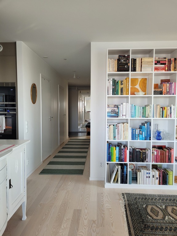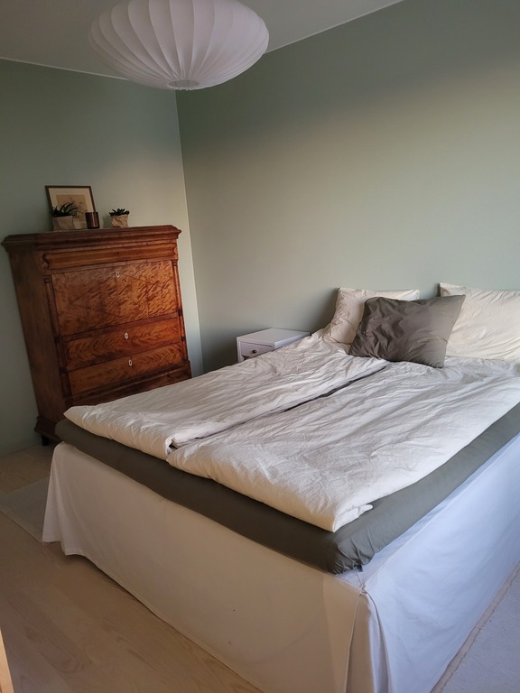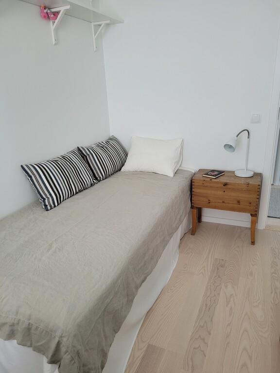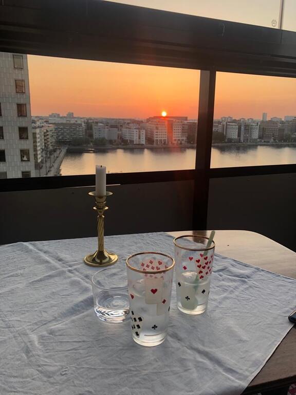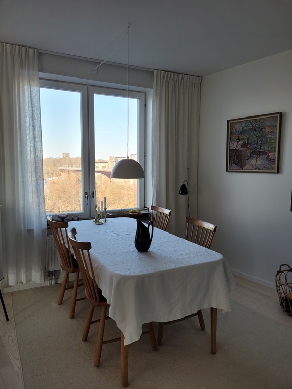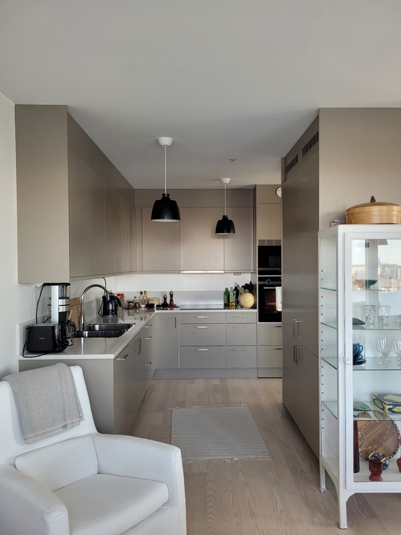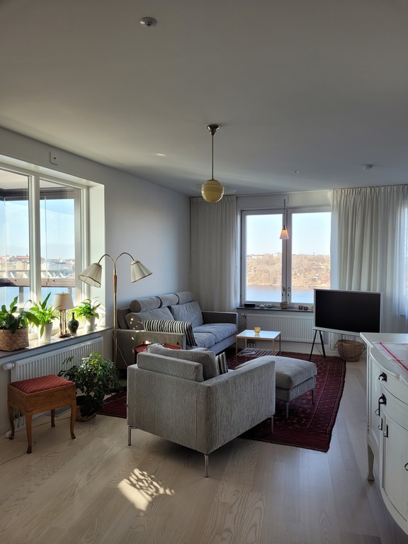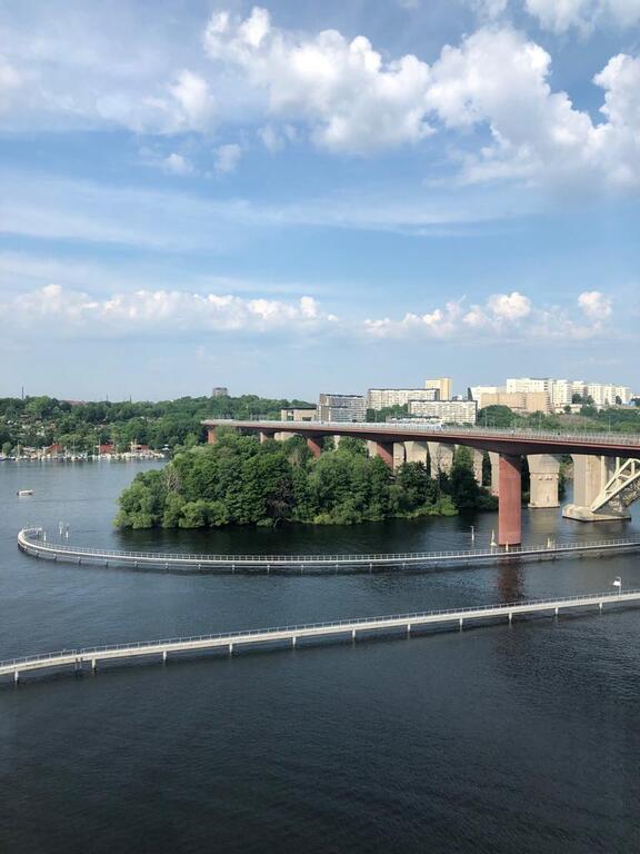 Our apartment is situated on the 10th floor in a brand new building, right by the water connecting Lake Mälaren to the Baltic sea. It's spacious and bright and has an open layout, with a combined living room and kitchen and great views over the lake and the city from all windows. The balcony is facing west and the sunset. The bedroom has a double bed and the second room a single bed and a desk.