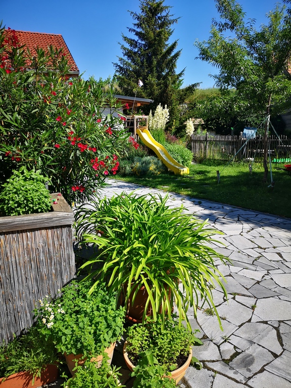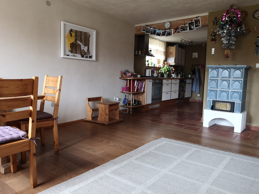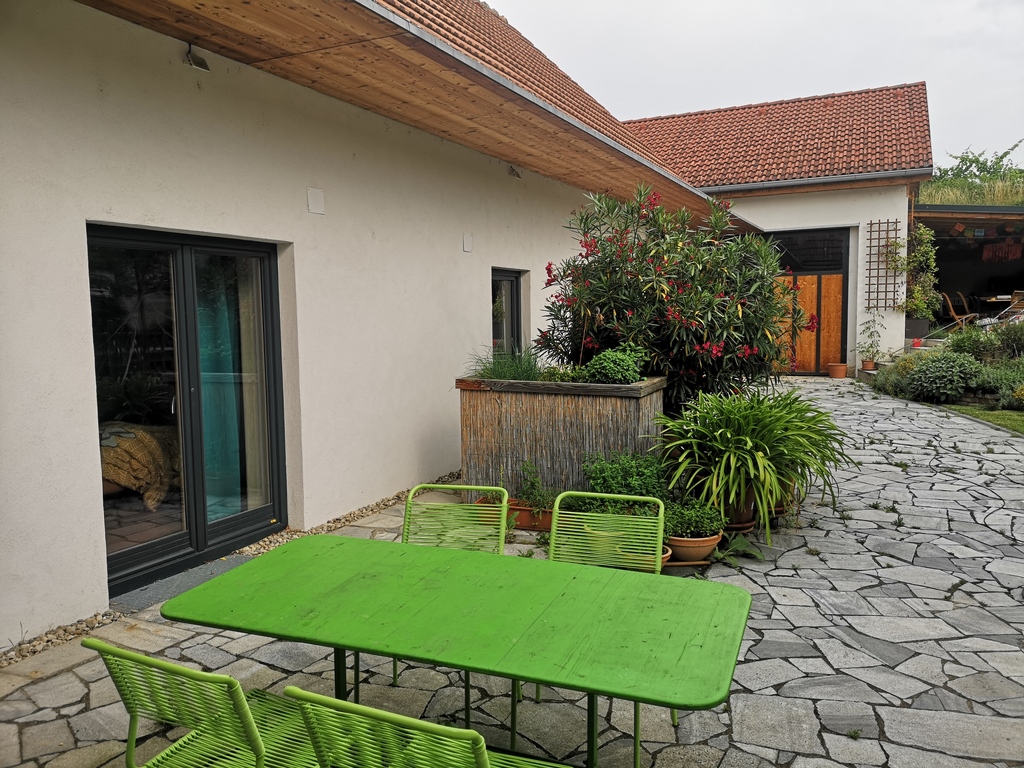 The very low residential building was renovated between 2010 and 2019 and extended by two rooms. In total it includes a living room with kitchen, a bedroom, a children's room and two workrooms. In all rooms there are beds or pull-out couches.