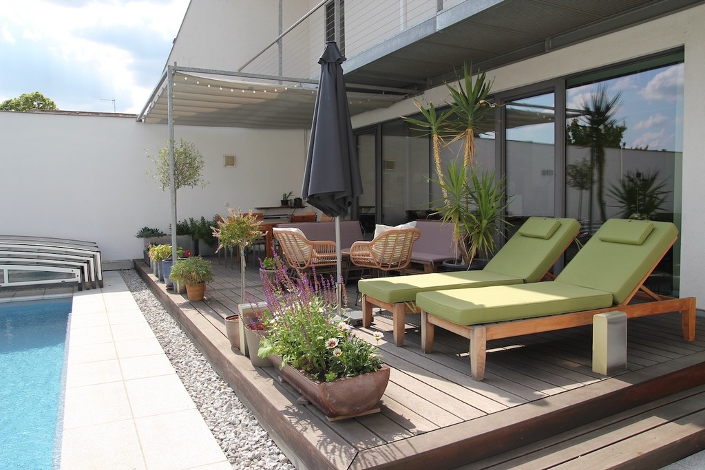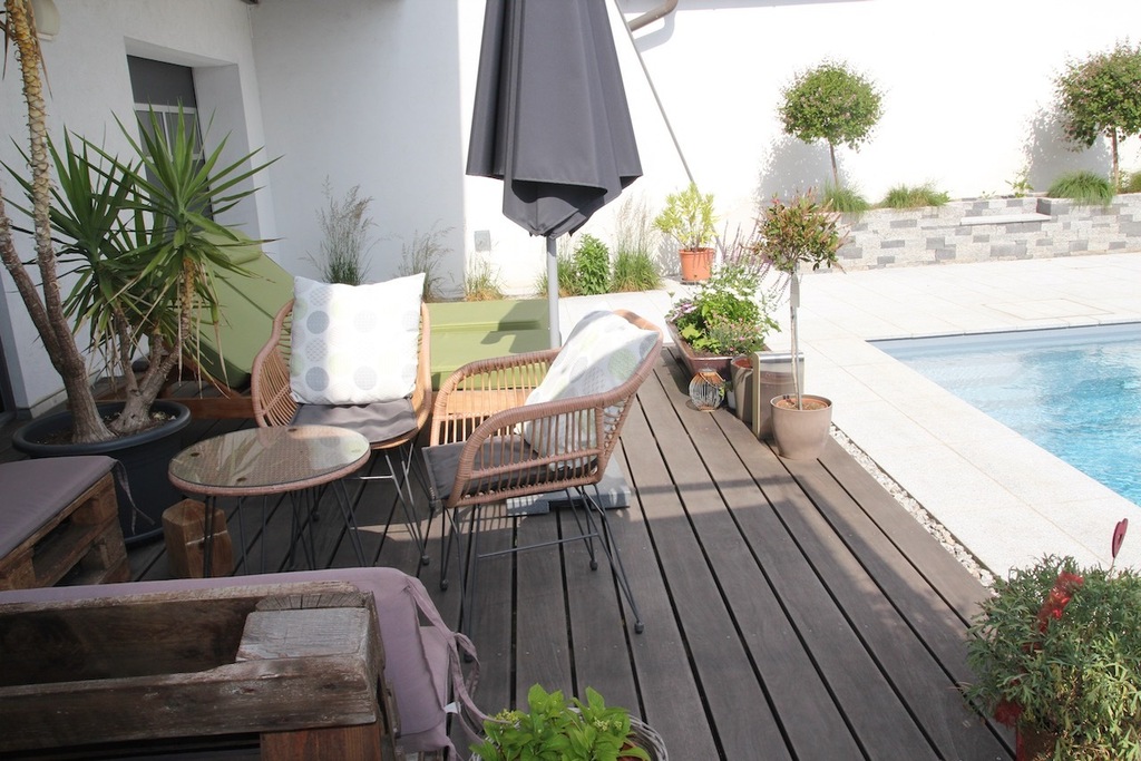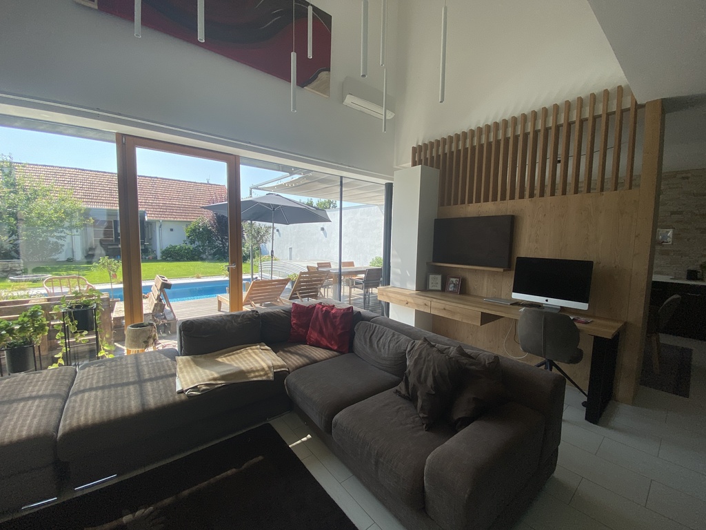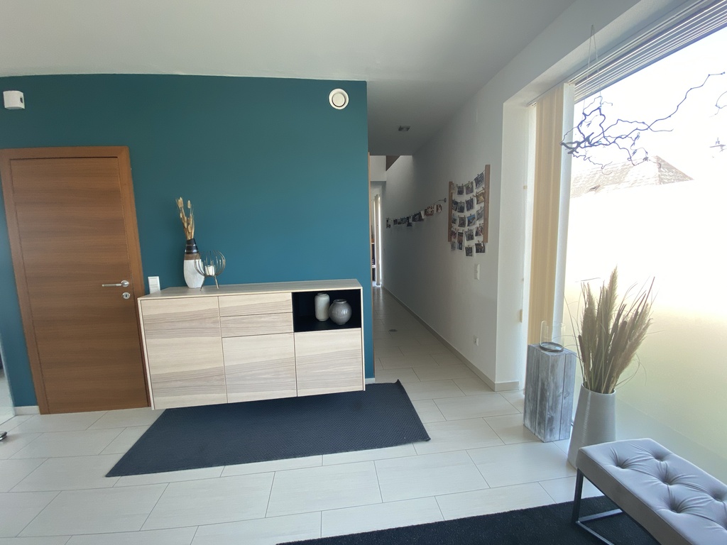 Unser Haus ist sehr modern, hell, lichtdurchflutet, mit vielen Glasscheiben und den Blick in unseren Garten.